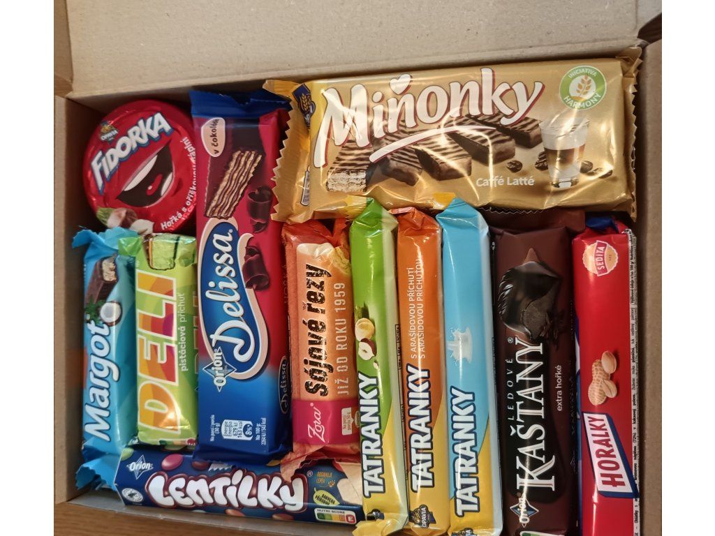 Horalka, 3x Tatranka, 2x Sojové řezy, 2x Lentilky, 3x Miňonky, 3x Delisa, 3x Fidorka, 3x Deli, 3x Kaštany a 3x Margotka